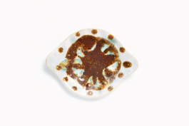 White stoneware hand formed plate decorated with yellow glaze, and speckles of green and transparent glaze , 2020